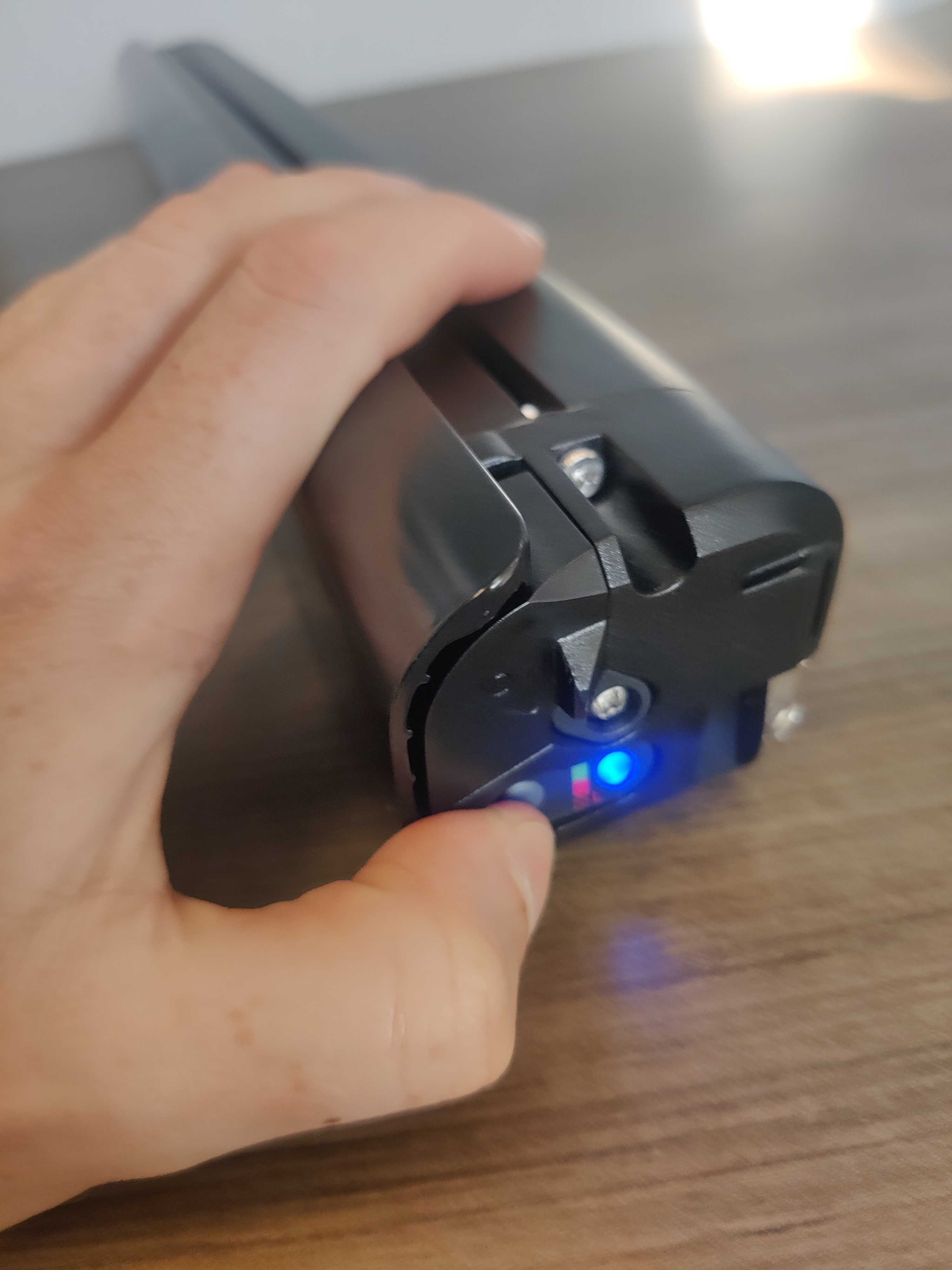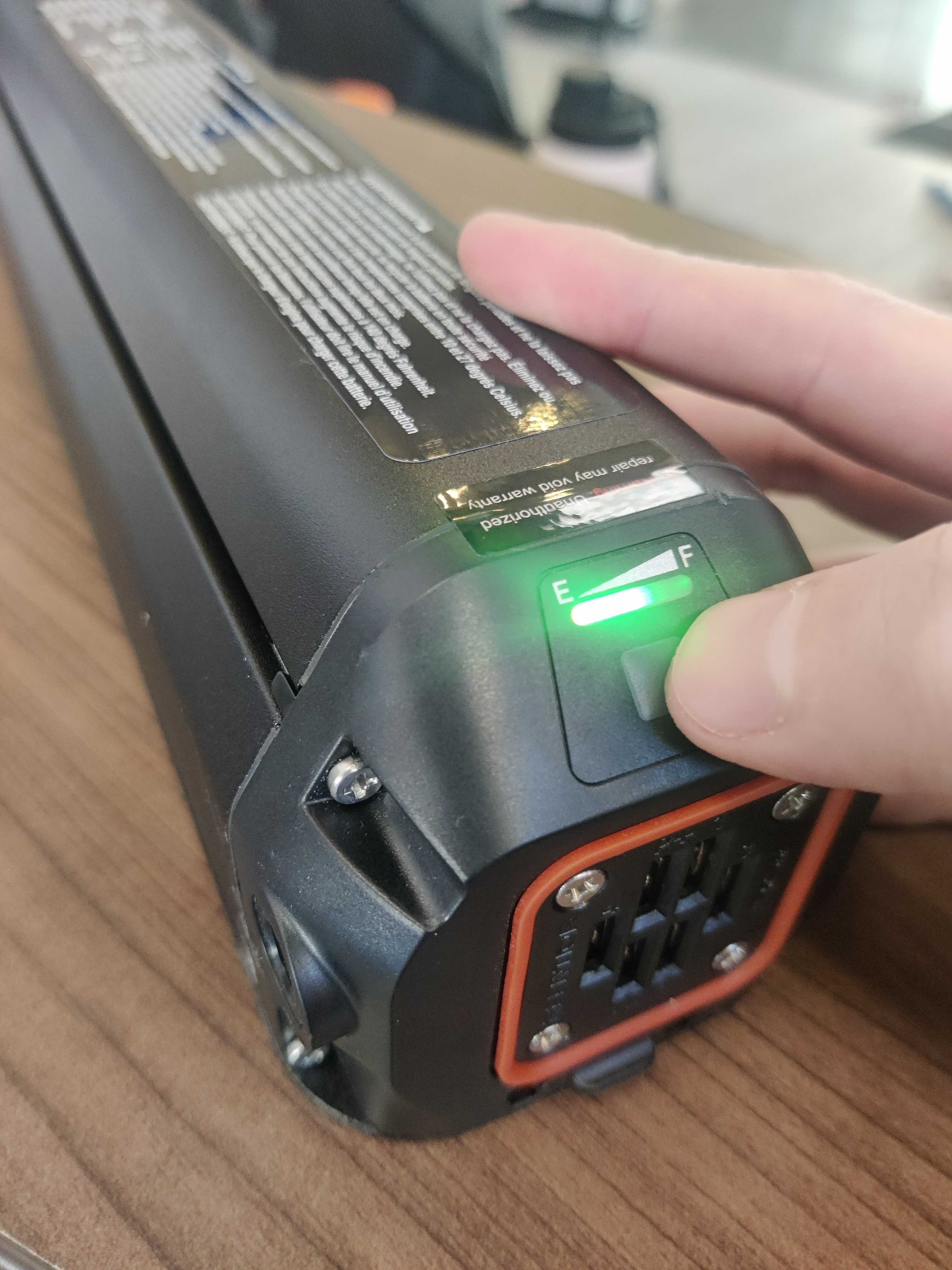 The battery state of charge indicator can be seen when the battery is removed from the frame on the top side of the battery. This single light will change colors depending on the charge level. Press the button to see the status.